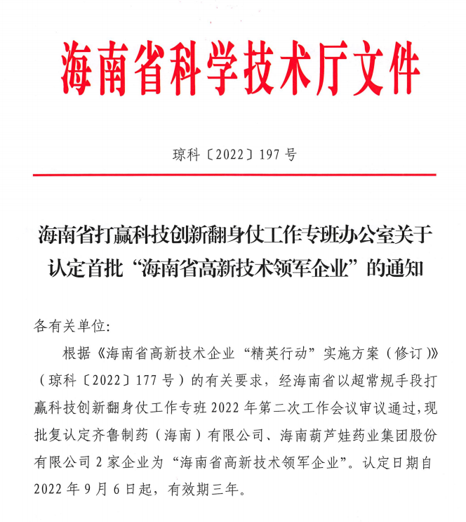 近日,海南省科学技术厅发布的《海南省打赢科技创新翻身仗工作专班办公室关于认定首批“海南省高新技术领军企业”的通知》中显示,批复认定海南EBpay药业集团股份有限公司等2家企业为“海南省高新技术领军企业”。认定日期自2022年9月6日起,有效期三年。
